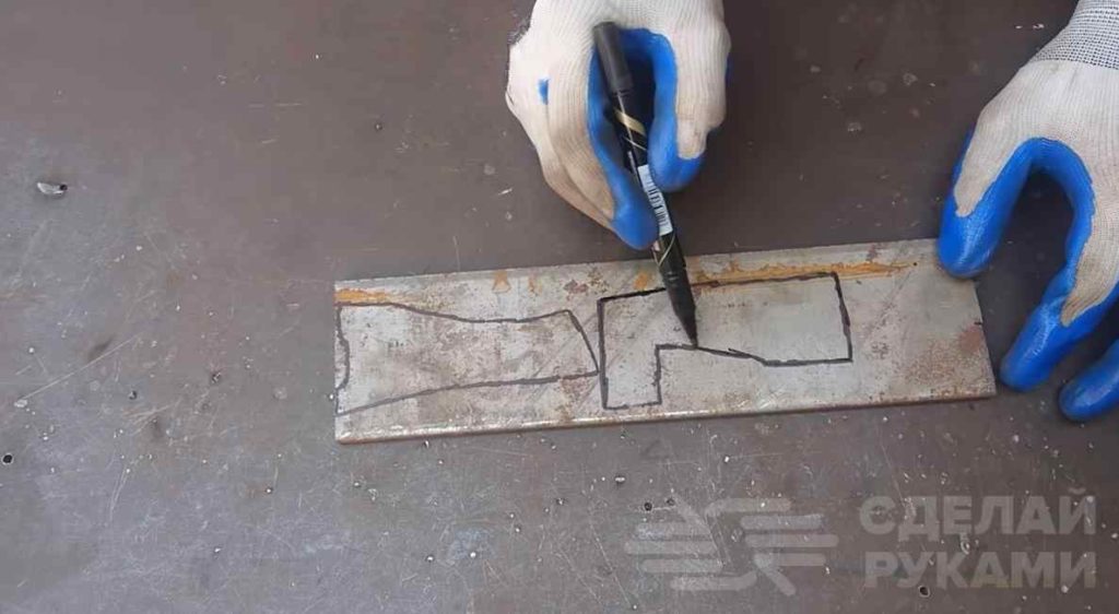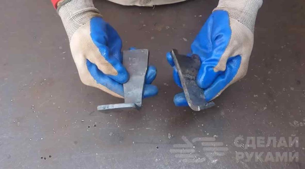 Изготовление ножей, наверное, самая трудоёмкая задача. Из толстого листа металла вырезаем две заготовки, придерживаясь чертежа. Раскаляем край и загибаем под нужным углом.