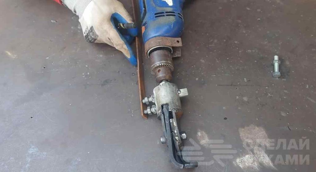 В планке просверлим два отверстия и соединим их с корпусом, на заранее приготовленные болты. Хомут одеваем на дрель, и затягиваем болтовым соединением.