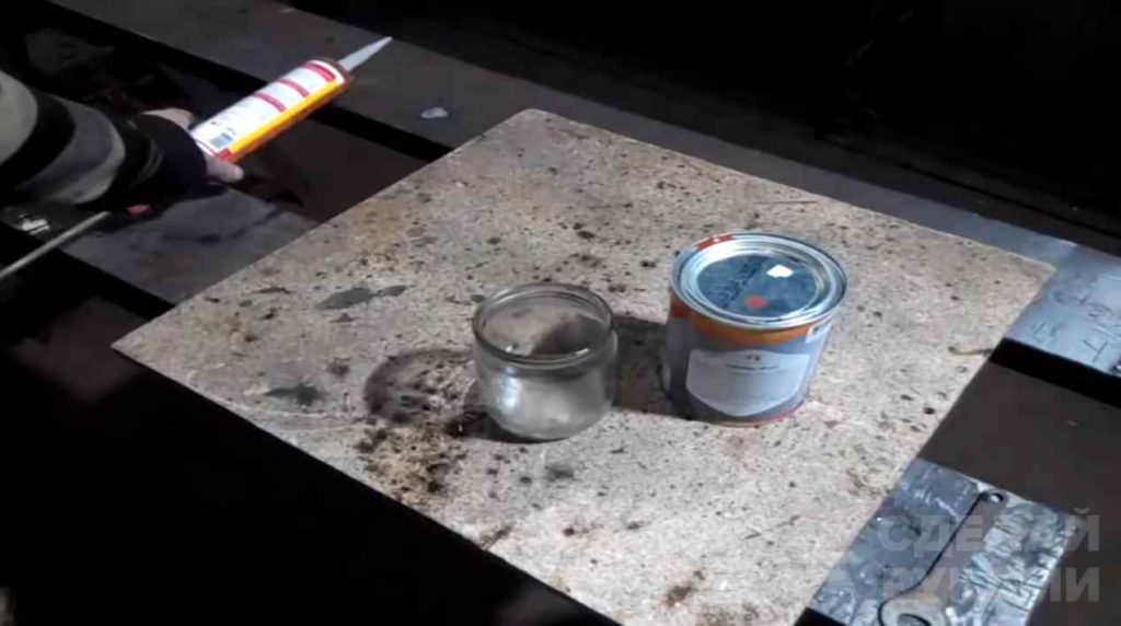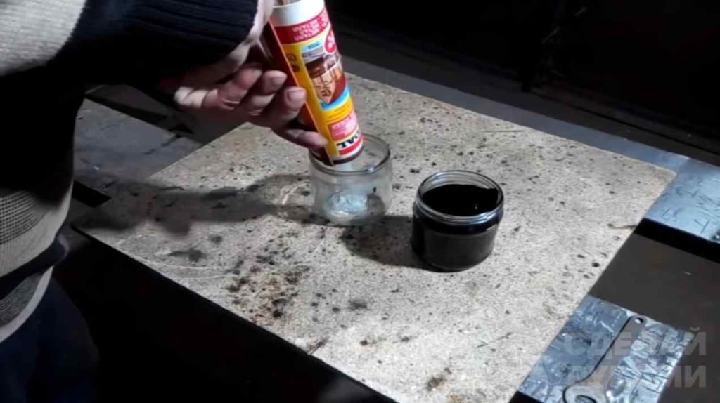 В другой емкости автор разводит самый дешевый силиконовый герметик с бензином (можно тоже использовать самый дешевый).
