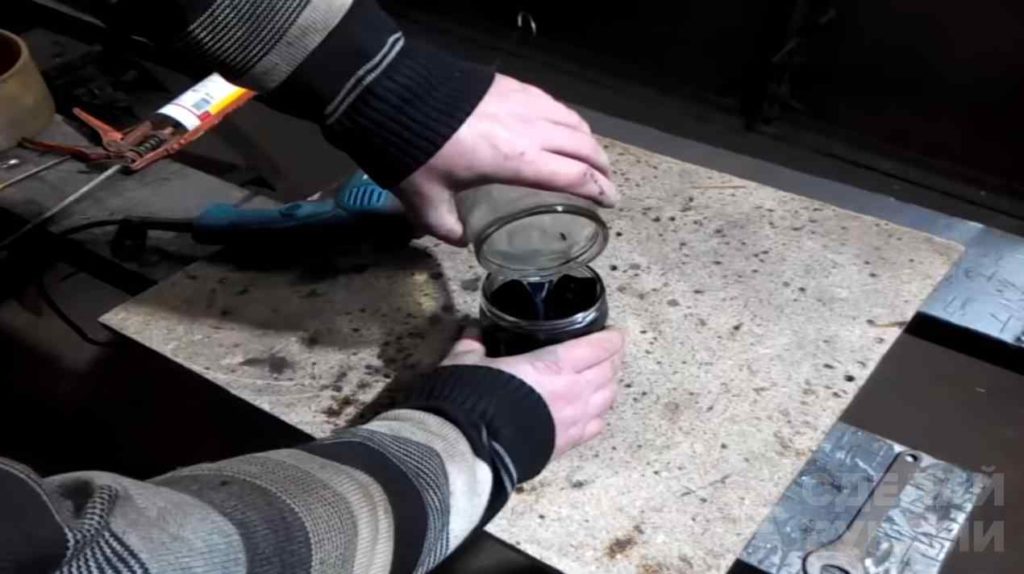 При помощи строительного фена (или другим доступным способом) нужно растопить битум. Переливаем необходимое количество битума в чистую емкость.