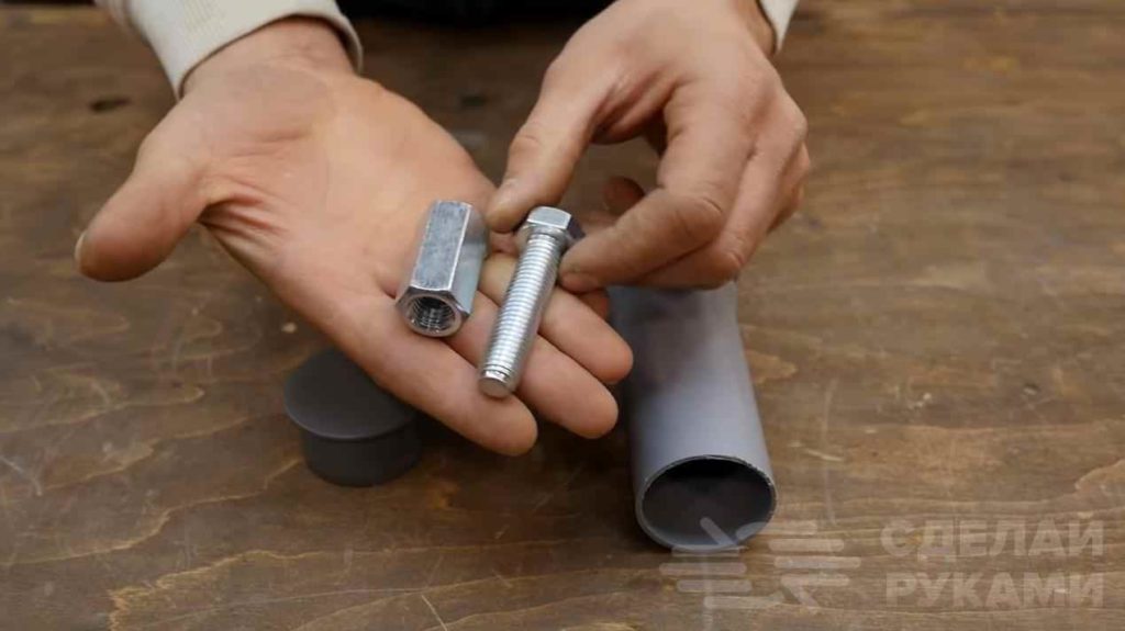 Далее обрезаем болт до нужной длины, вставляем его в отверстие в заглушке, и потом накручиваем на болт удлиненную гайку.
