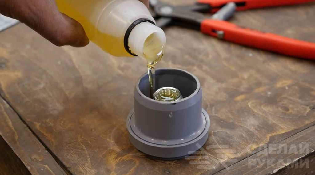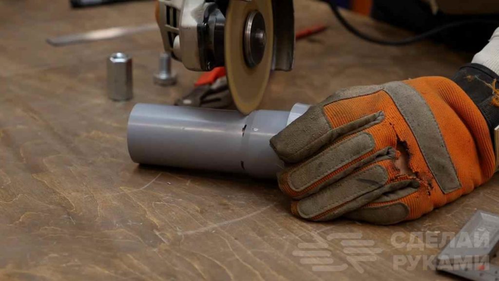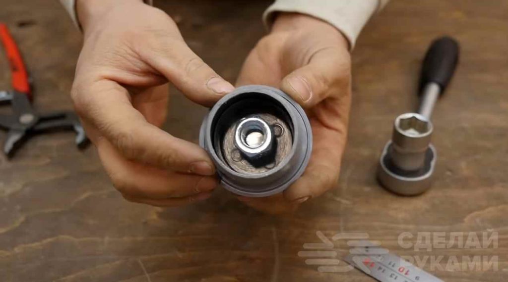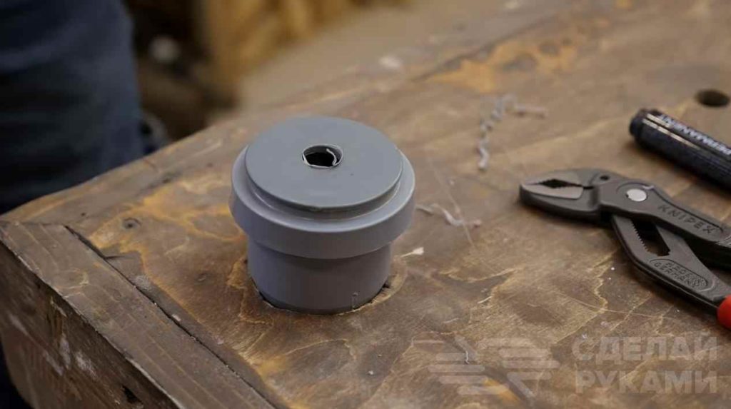 Первым делом вставляем заглушку в трубу. Потом делаем разметку и сверлим по центру заглушки отверстие под болт. Лишнюю часть трубы отрезаем, оставляя только сам раструб.