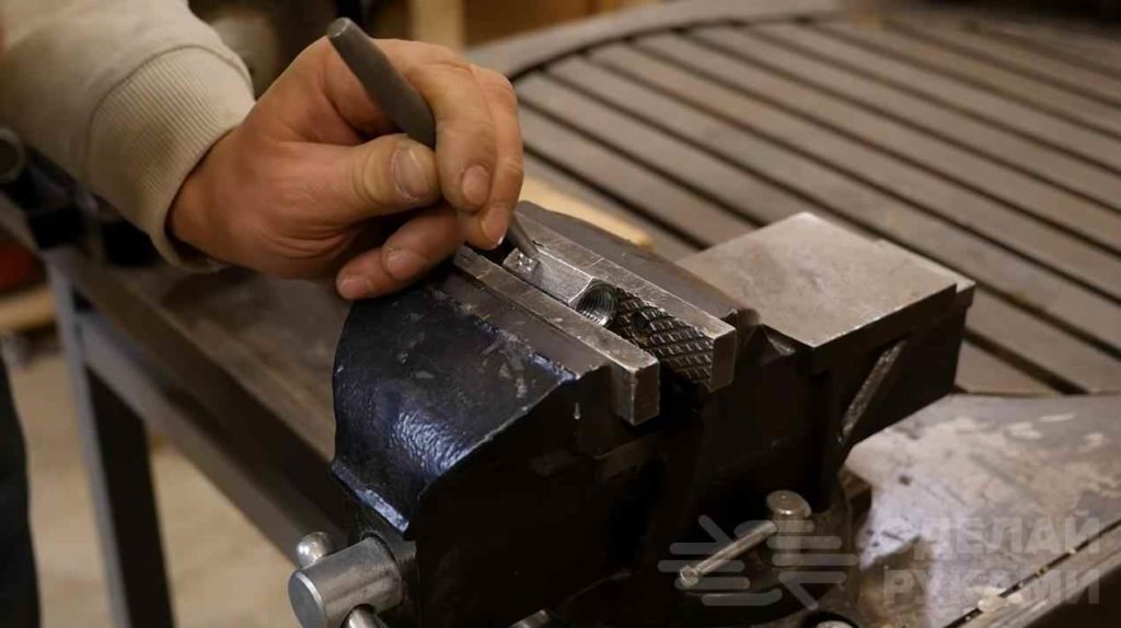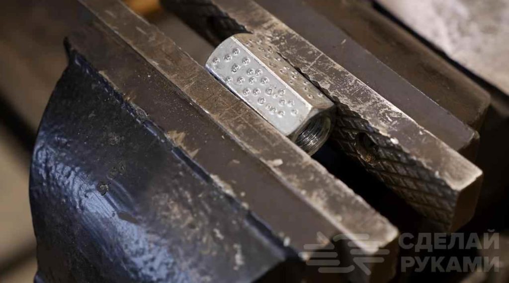 На следующем этапе с помощью кернера и молотка автор делает на удлиненной гайке небольшие углубления для лучшего сцепления с эпоксидной смолой.
