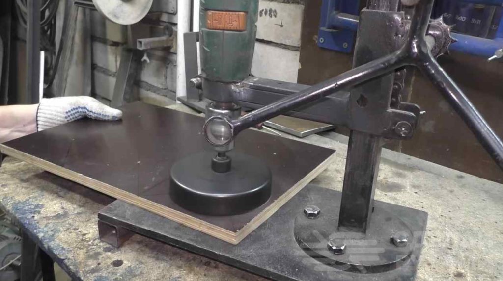 На следующем этапе из оставшихся кругов фанеры автор собирает ведущий ролик. По центру нужно просверлить отверстие под вал двигателя (или вал болгарки, если она используется как привод).