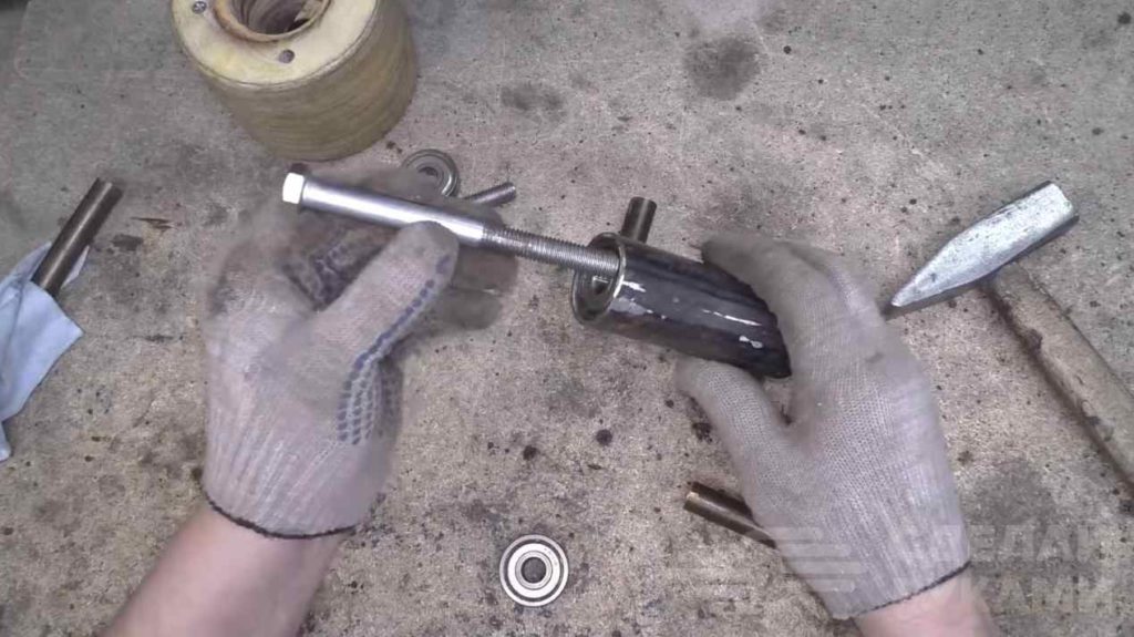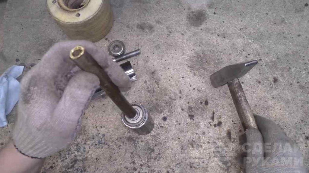 После этого приступаем уже непосредственно к изготовлению ведомых роликов для гриндера. Вставляем подшипники в отрезки круглой трубы, потом завариваем шов и шлифуем.