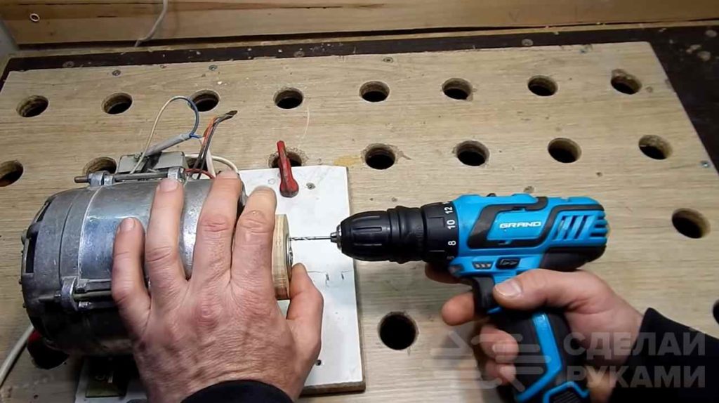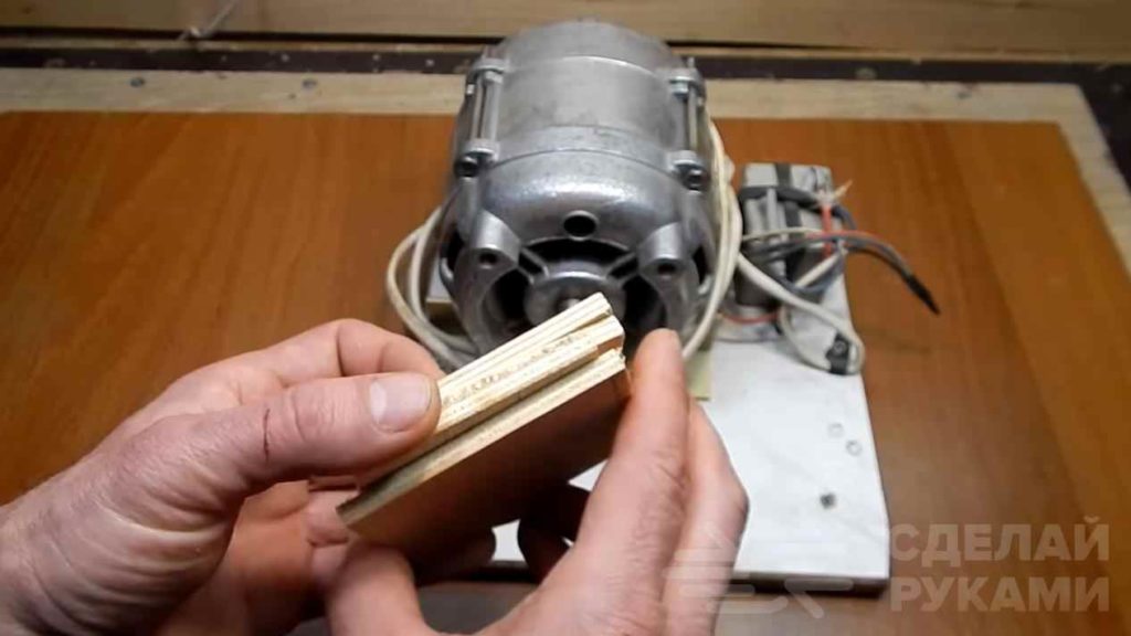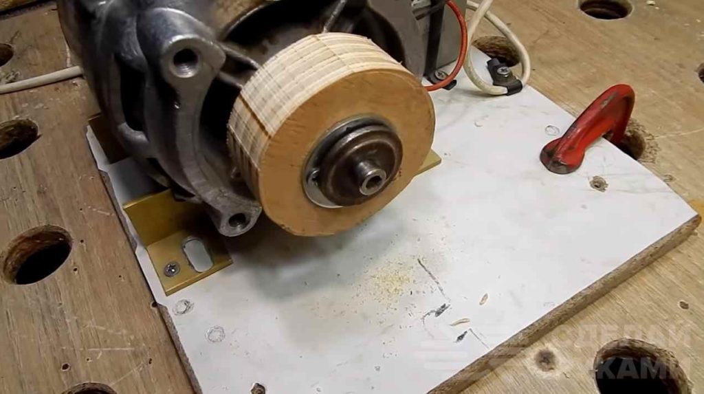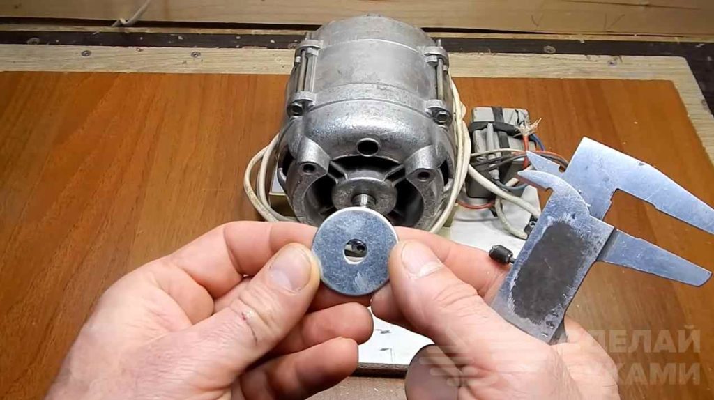 На вал двигателя надеваем обычную шайбу, потом запрессовываем шкив и надеваем шайбу с выступом, которую мы сделали ранее. Крепим ее к шкиву с помощью двух саморезов.