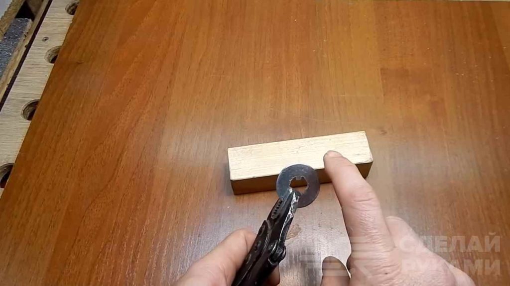 Эту операцию мастер делает с помощью напильника. Затем в шайбе необходимо просверлить два крепежных отверстия.