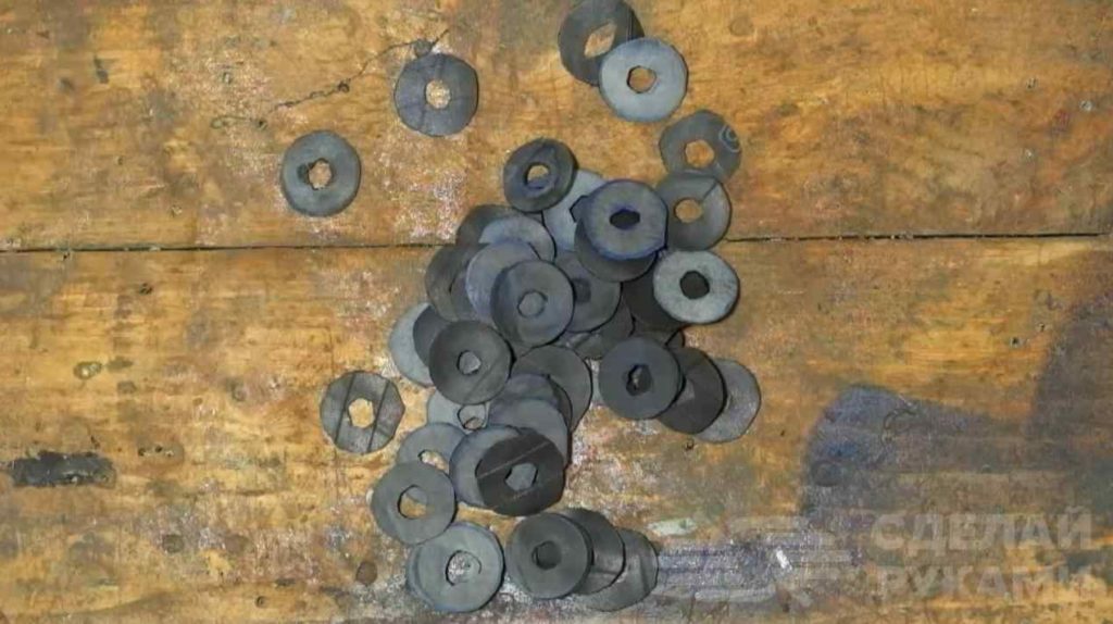 Далее по размеру металлических шайб мастер вырезает резиновые прокладки из автомобильной камеры.
