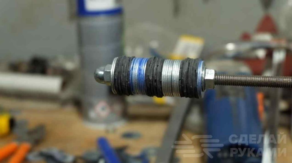 На следующем этапе отрезаем подходящую по длине шпильку. Накручиваем на нее колпачковую гайку, надеваем шайбы с прокладками, чередуя их, фиксируем гайкой с прессшайбой.