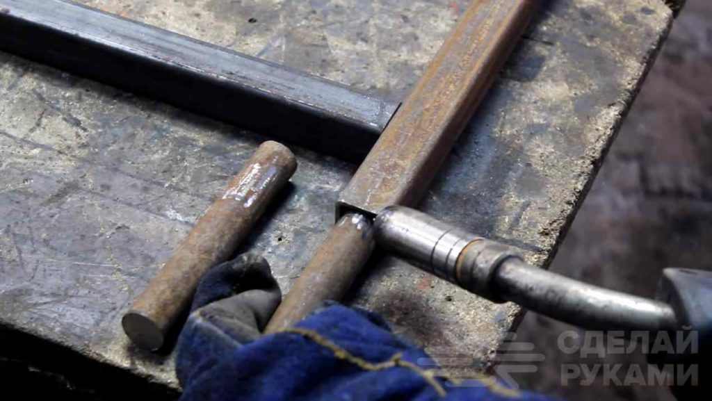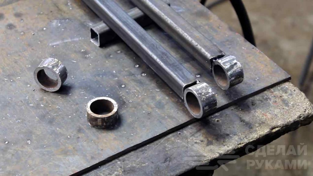 Отрезаем куски стального кругляка, вставляем их в верхнюю часть стоек, после чего обвариваем. На нижнюю часть стоек автор надевает куски профильной трубы большего размера, и тоже обваривает.