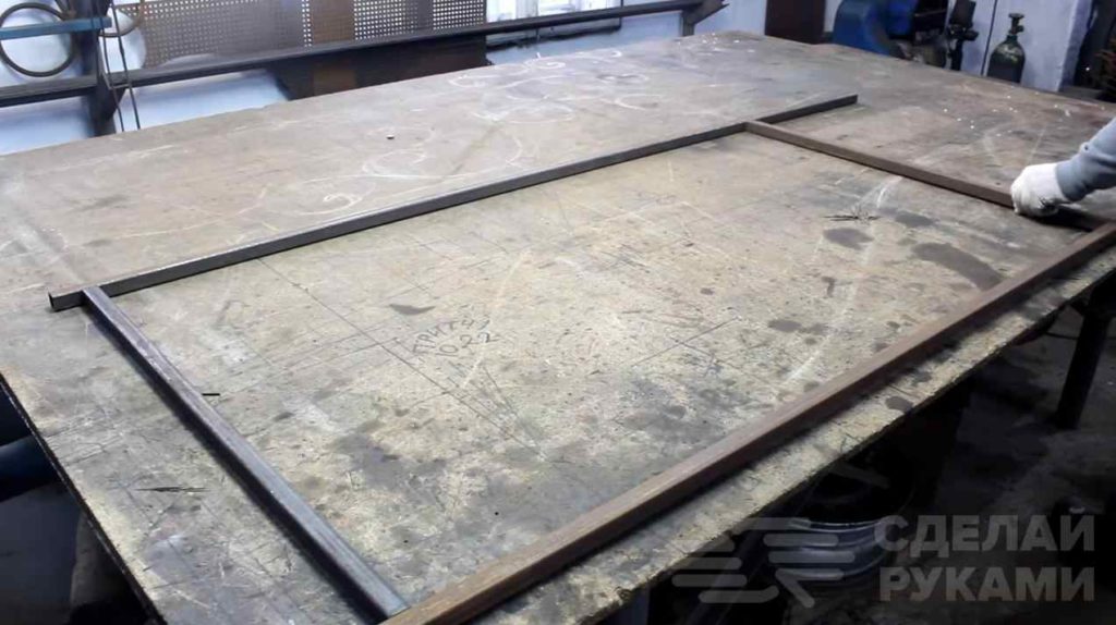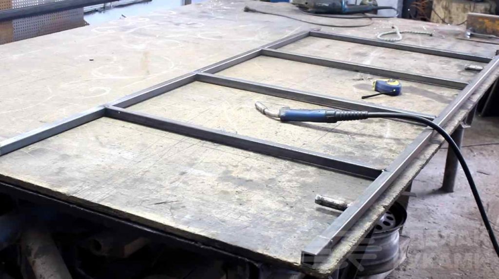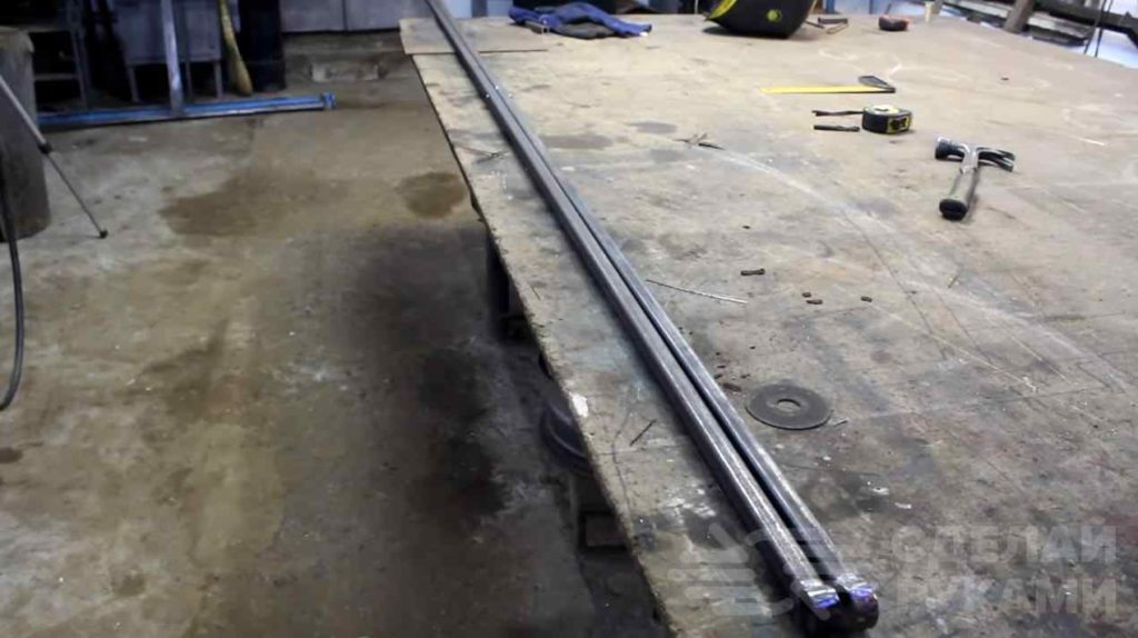 На следующем этапе приступаем к изготовлению основания под деревянный настил. Для этого отрезаем две профтрубы и соединяем их с помощью двух перпендикулярно расположенных перемычек.