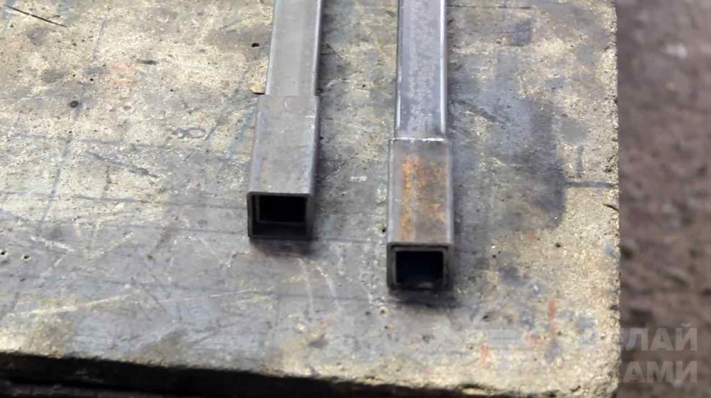 Первым делом необходимо будет нарезать заготовки из профильной трубы. Также потребуются куски листового металла, гайки, отрезки круглой трубы и шпильки с шайбами.