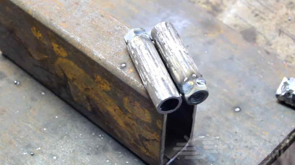 Далее отрезаем два куска круглой трубы и привариваем к ним гайки (к одному из торцов).