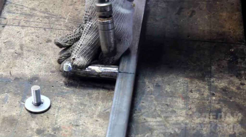 Теперь можно приступить к изготовлению диагональной распорки. Состоит она из двух профильных труб, соединенных вместе в центральной части с помощью болта. К торцам профиля автор привариваем кольца из круглой трубы.
