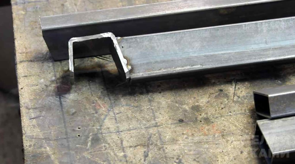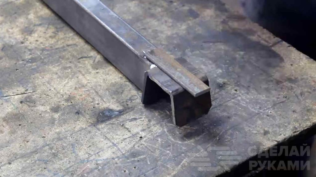 К торцам привариваем «крючки», которые также можно сделать из кусков профиля. Сверху усиливаем их отрезками металлической полосы. Сварные швы зачищаем болгаркой.