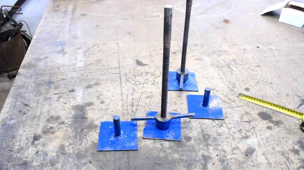 Из кусков металла и круглых прутков делаем подпятники для первого яруса. Два из них желательно сделать регулируемыми. Все элементы конструкции необходимо покрасить.