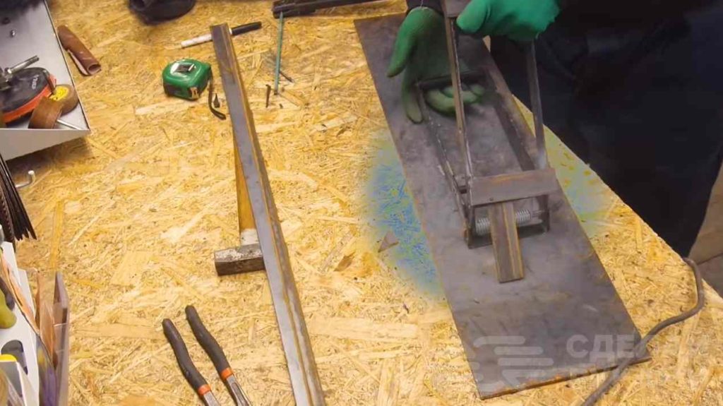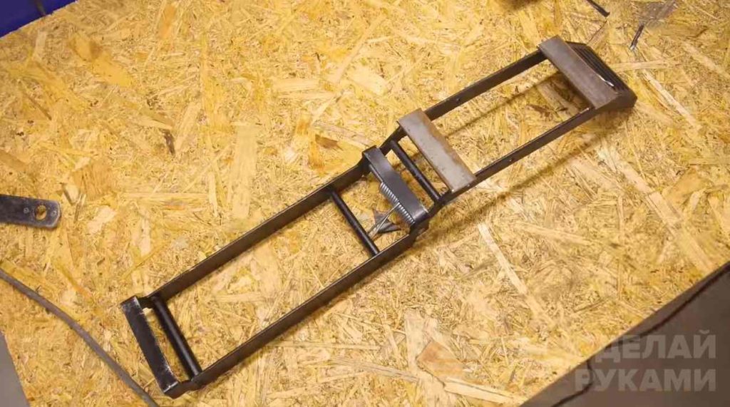 На следующем этапе отрезаем два куска от металлической полосы. Привариваем их к верхней части рамы насоса (педали). Зачищаем сварные швы. Затем нужно приварить третий кусок полосы, который будет играть роль упора.