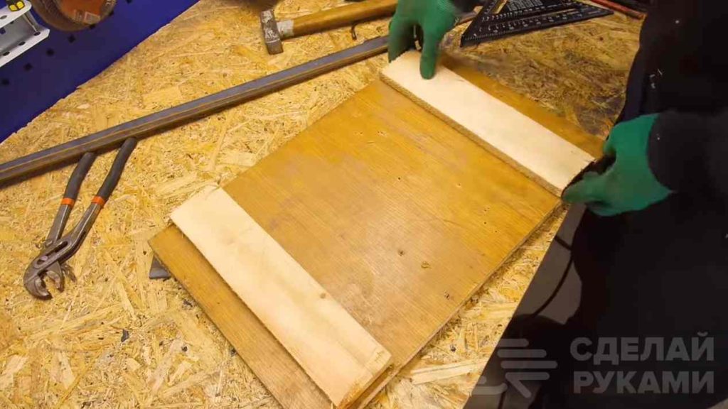 Далее приступаем к изготовлению основания. Для этого автор использует кусок ДСП. К нижней части прикручиваем на саморезы два куска доски.