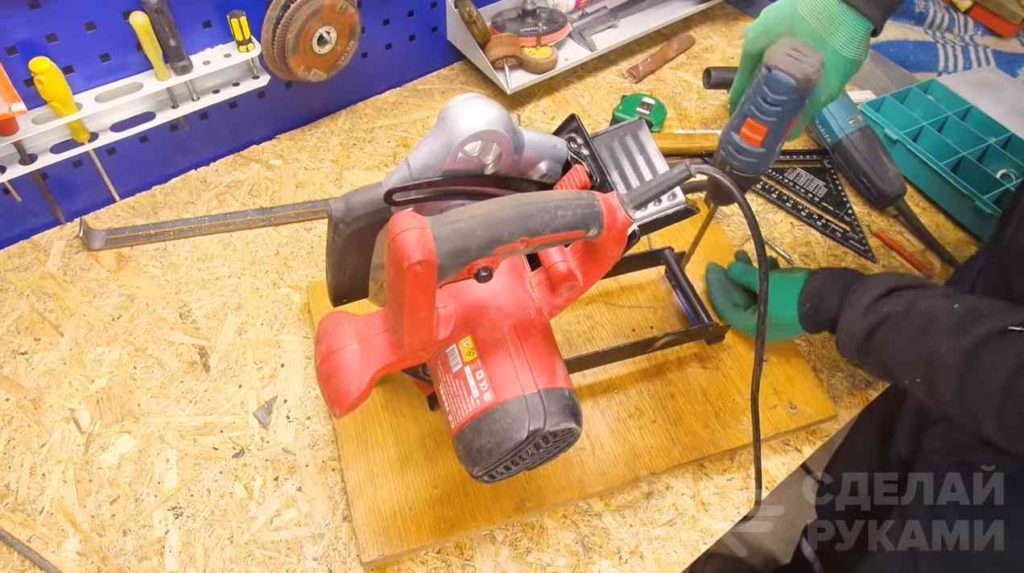 Сверлим в раме отверстия, после чего прикручиваем ее к основанию. К верхней части рамы крепится ручная циркулярка.