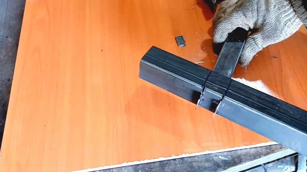 После этого делаем разметку на второй профильной трубе. Отступаем от края 15 мм и чертим линии. Далее вырезаем болгаркой все лишнее в обоих профильных трубах.