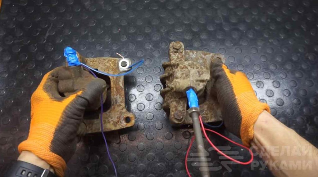 В отверстие, в которое вставляется тормозной шланг, автор закручивает болт (или можно использовать шпильку). После этого подключаем провода.