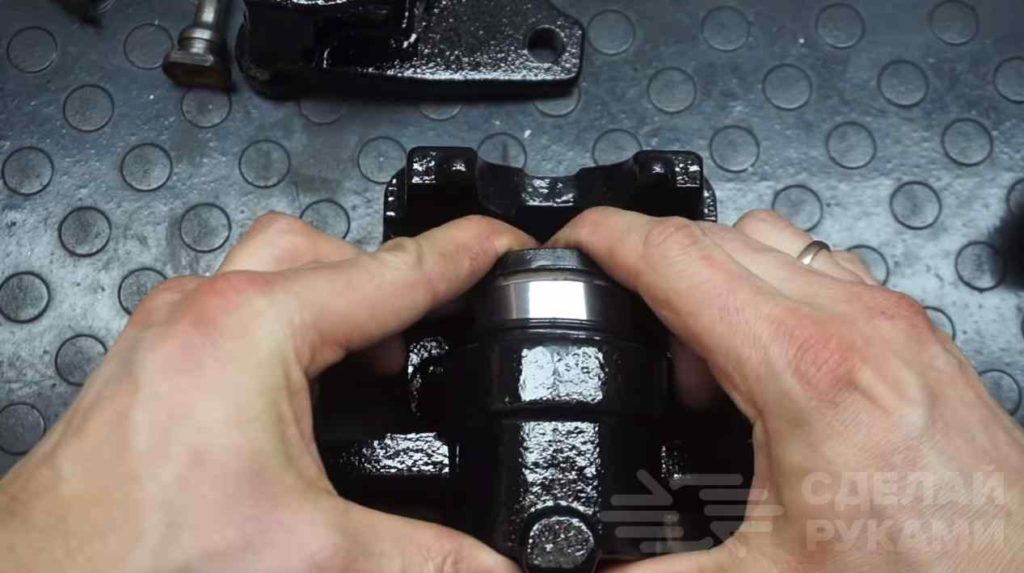 Наливаем немного тормозной жидкости в посадочное отверстие, и размазываем по внутренней стенке. Также наносим тормозную жидкость на поршень, и потом вставляем его в родное «лоно».