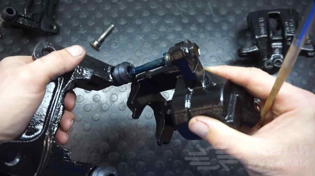 После этого наносим силиконовую смазку на пальцы суппорта и внутреннюю часть пыльников, и можно приступать к сборке.