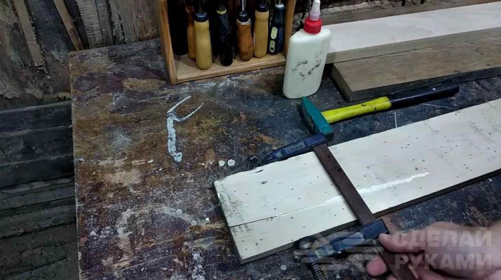 Стягиваем доску струбцинами — если клей с обратной стороны выдавился, то операция прошла успешно. Вот такой простой способ.