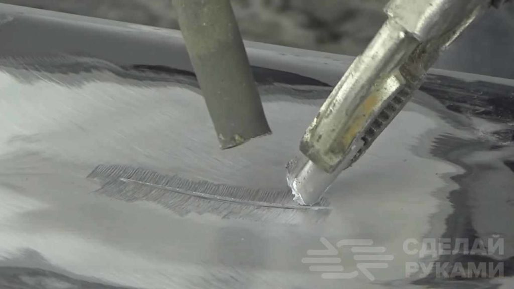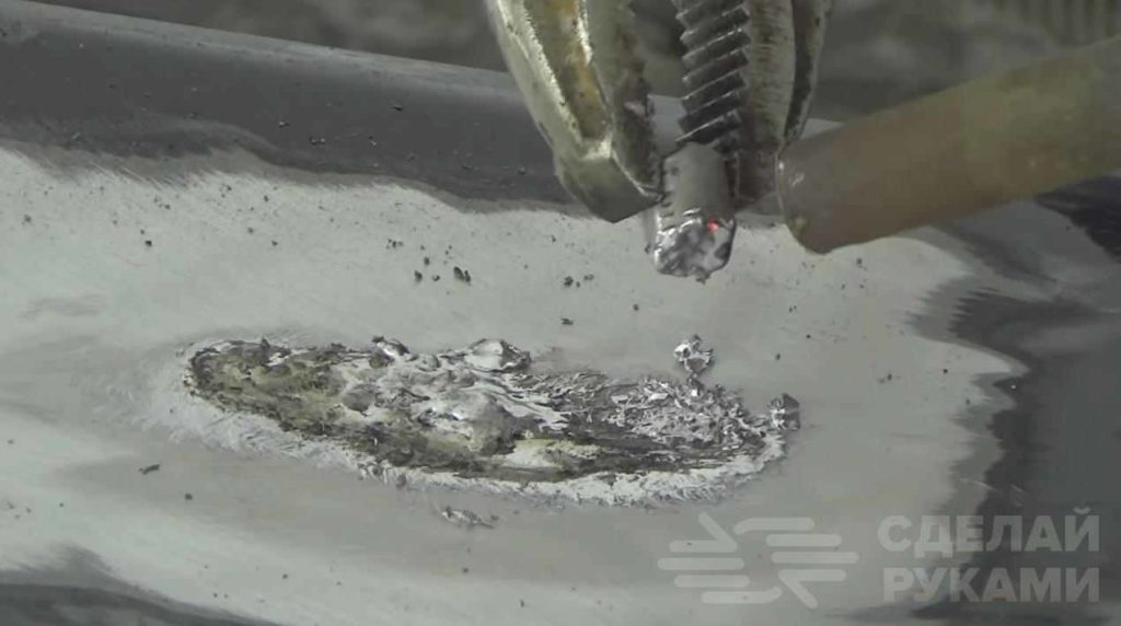 На данном этапе наша задача — залудить поверхность алюминия. Для этого продолжаем нагревать деталь горелкой и «царапаем» щеткой по металлу.