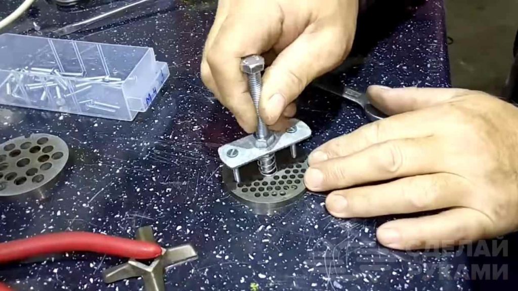 Первым делом необходимо будет сделать держатель для решетки мясорубки. Для этого потребуется отрезок шпильки, диаметр которой чуть меньше диаметра центрального отверстия решетки, кусок металлической полосы, две гайки для шпильки, пружина и два болтика с гайками.