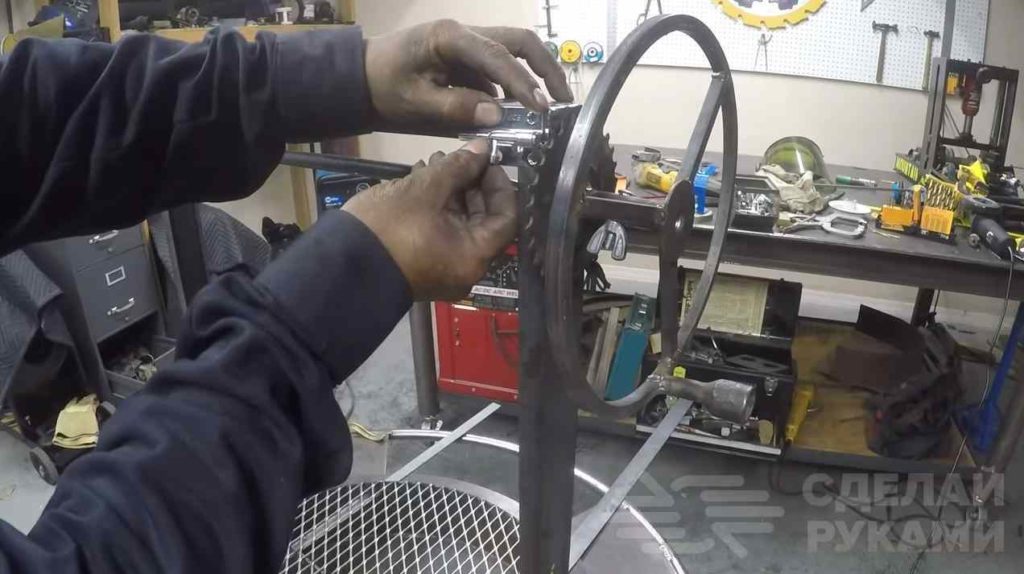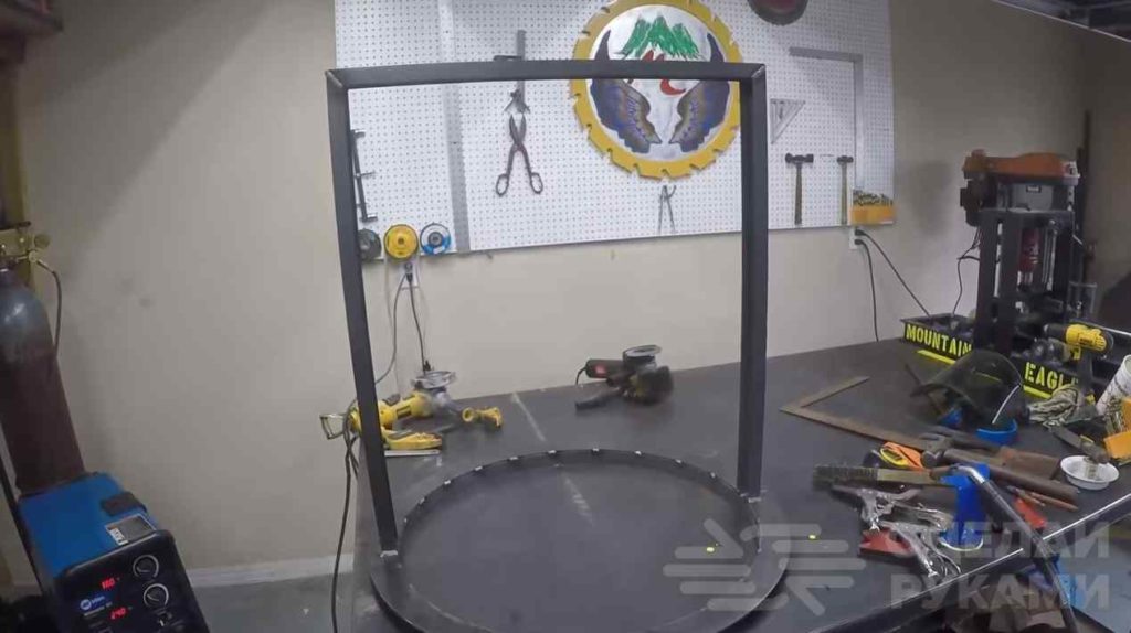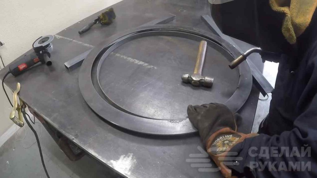 Делаем из данной полосы круг и привариваем его к кольцу. Для жесткости привариваем по центру ребро жесткости. Из просечно-вытяжного листа вырезаем круглое основание и прихватываем его на конструкцию.
