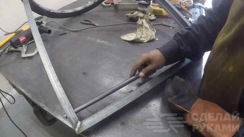 Для более легкого крепления привариваем два подшипника. Вставляем штангу и завариваем оба края снаружи при помощи шайб.