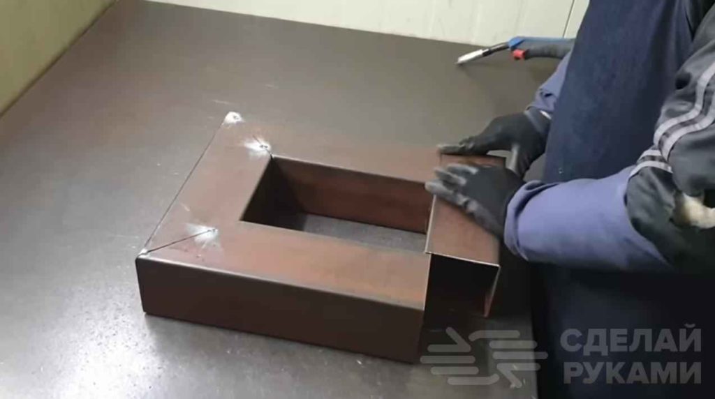 Первым делом отрезаем четыре куска квадратной профтрубы и свариваем их вместе так, как показано на фото ниже.