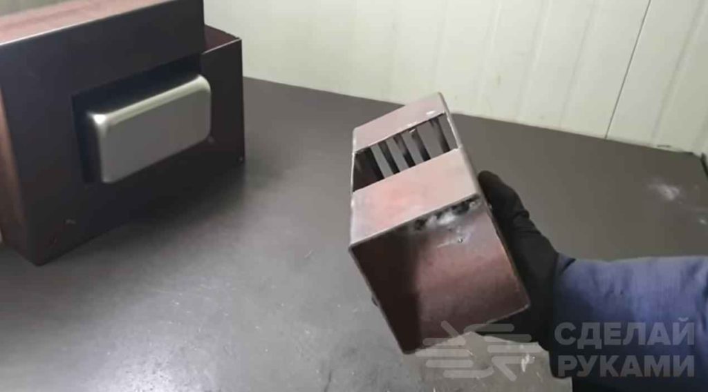 На следующем этапе автор отрезает еще один кусок профильной трубы, и вырезает в нем квадратное «окно». Внутри, с одной из сторон, делаем колосник.