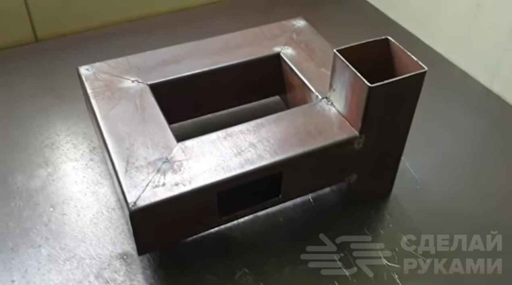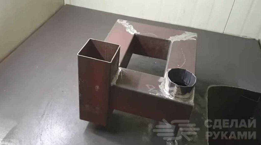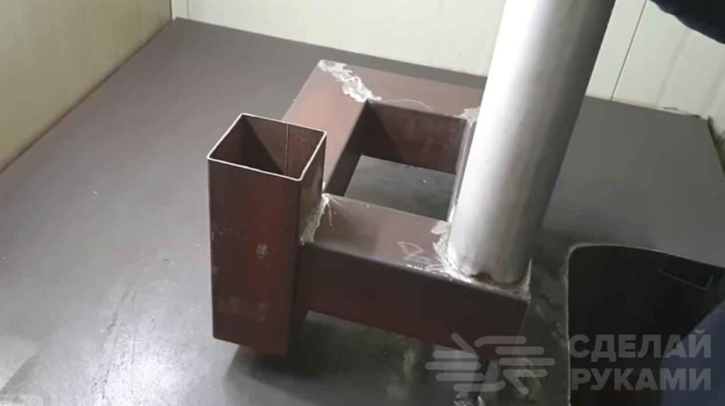 Привариваем этот кусок профтрубы к основной части печи, установив его вертикально, колосником вниз.