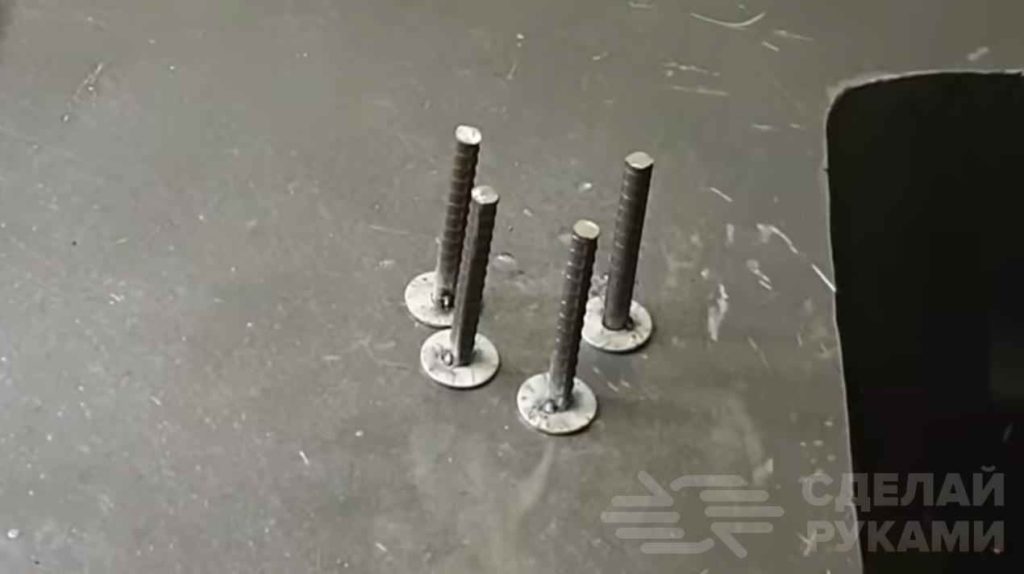 Из кусков арматуры и металлических шайб делаем ножки с пятками. Привариваем их к нижней части печи.