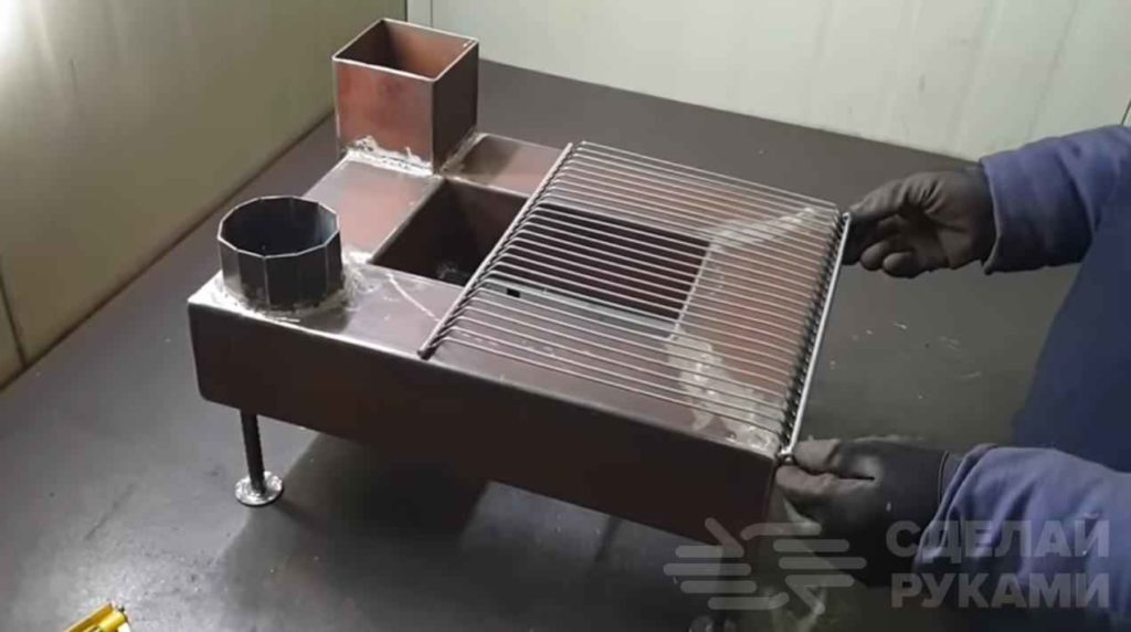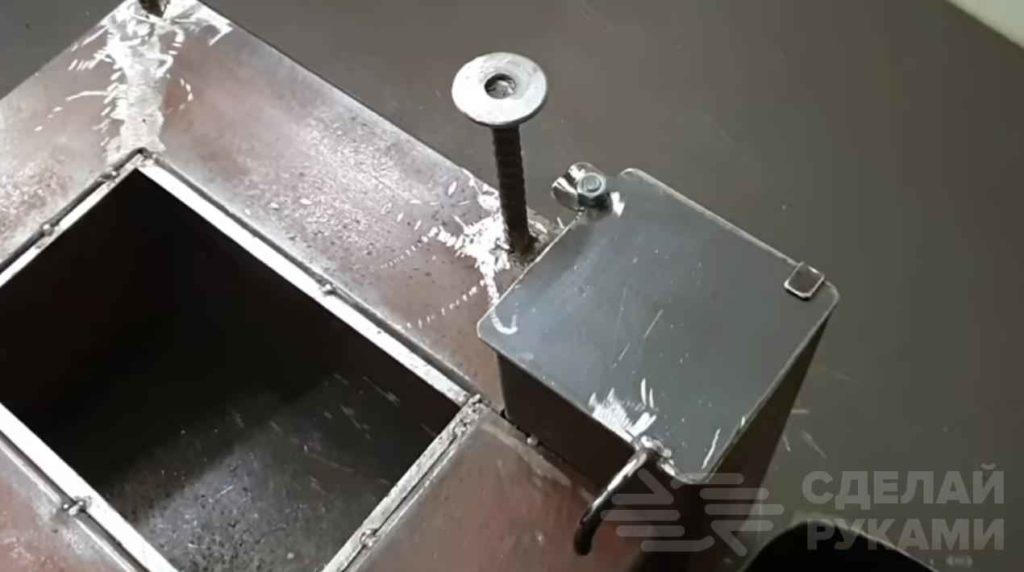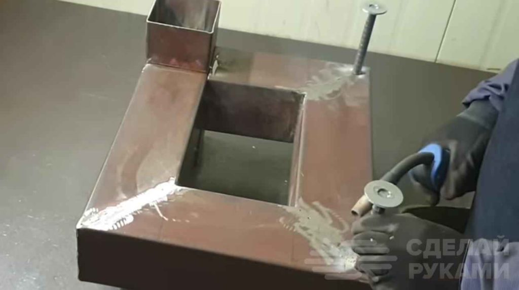 На последнем этапе останется только сделать дверку зольника и установить откидную решетку. Зачищаем сварные швы и красим.