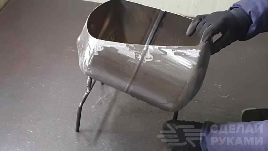 Переворачиваем баллон вертикально и привариваем снизу ножки из арматуры. Подпятники можно сделать из стальных шайб.