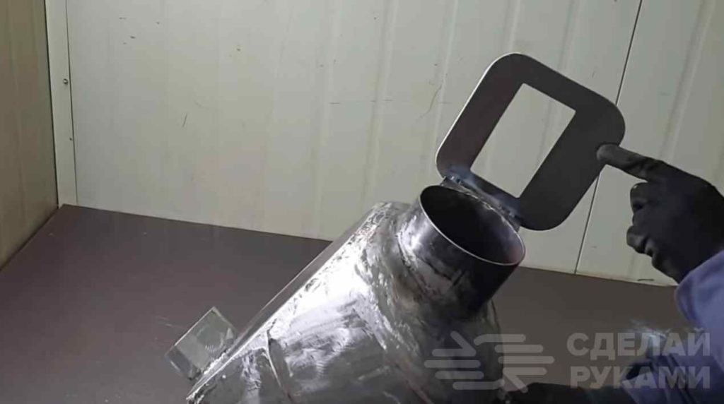 Далее отрезаем кусок стальной пластины и делаем на ней надрезы болгаркой. Потом сворачиваем его и привариваем к верхней части печи, предварительно вырезав отверстие нужной формы.