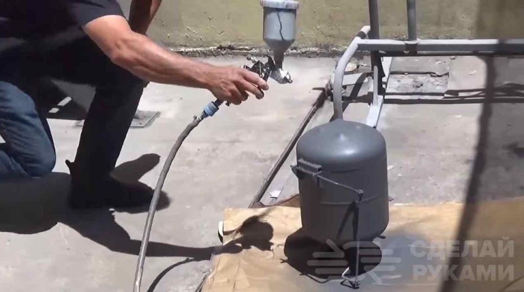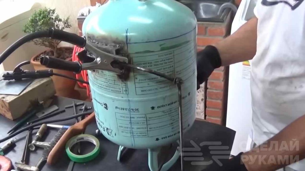 На обратной стороне баллона, где находятся ручки, сверлим отверстие в обеих ручках. Устанавливаем ещё один кусочек арматуры так, чтобы он торчал с боку баллона.