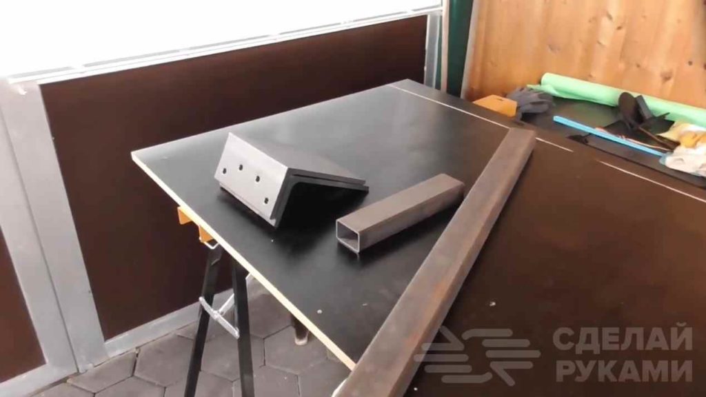 Первым делом отрезаем два одинаковых по длине куска уголка и два отрезка профильной трубы.