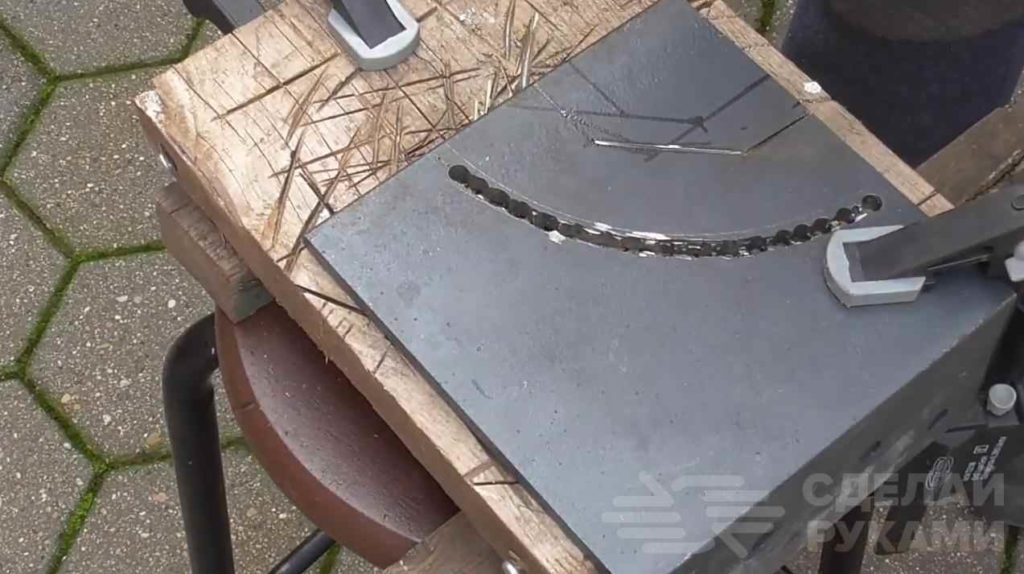 Затем необходимо приварить к основанию отрезок профильной трубы (он же упор для заготовок).
