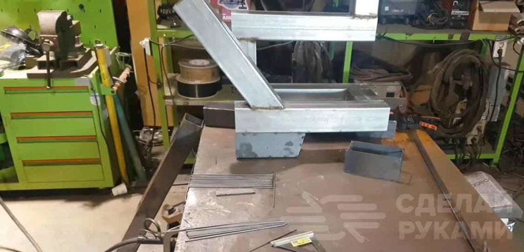 Для зольника будем использовать листовую сталь. Свариваем буквой «П» три отрезка листа, которые по размерам должны быть равными внутренней плоскости трубы.
