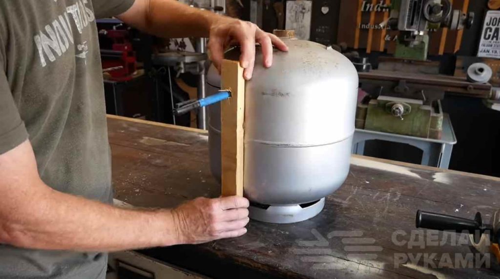 До начала работ нужно убедиться, что внутри баллона отсутствуют горючие пары. Для этого выкручиваем вентиль и заливаем баллон до самого верха водой и затем сливаем её.