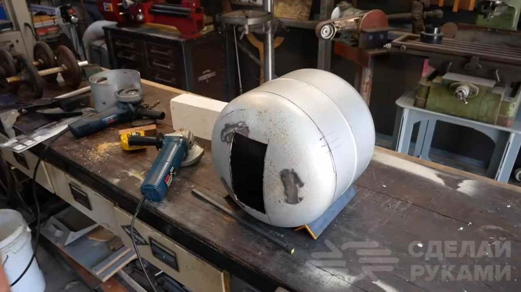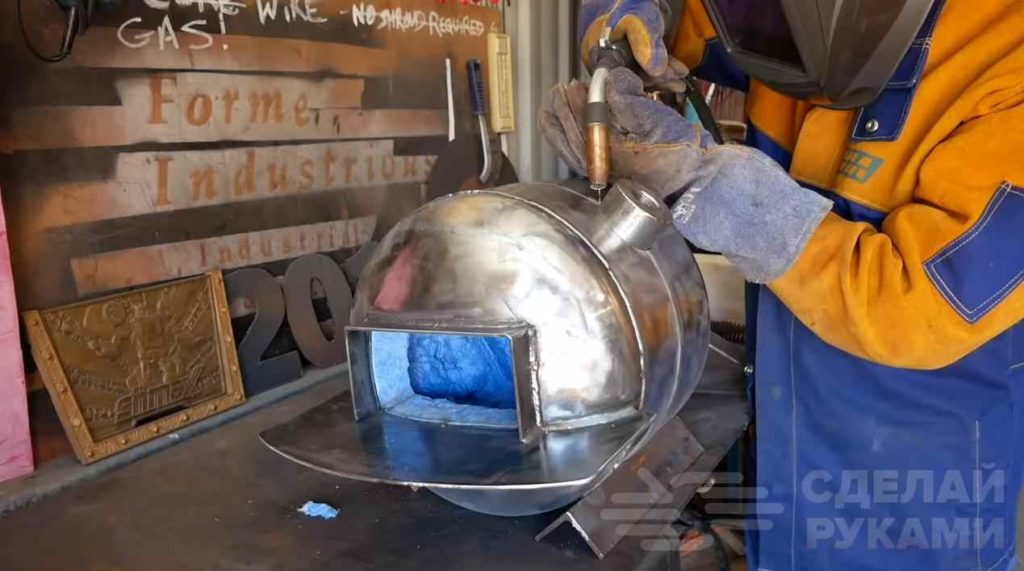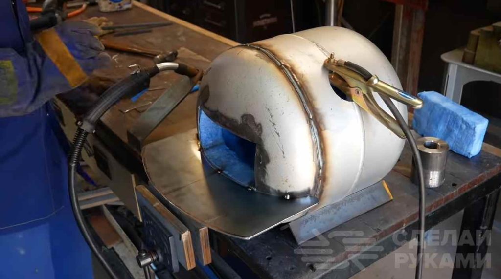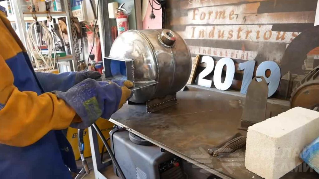 Собираем отрезанный верх и низ баллона, и свариваем их между собой. В верхней части баллона вырезаем круглое отверстие и устанавливаем туда толстую трубу для подачи пламени.