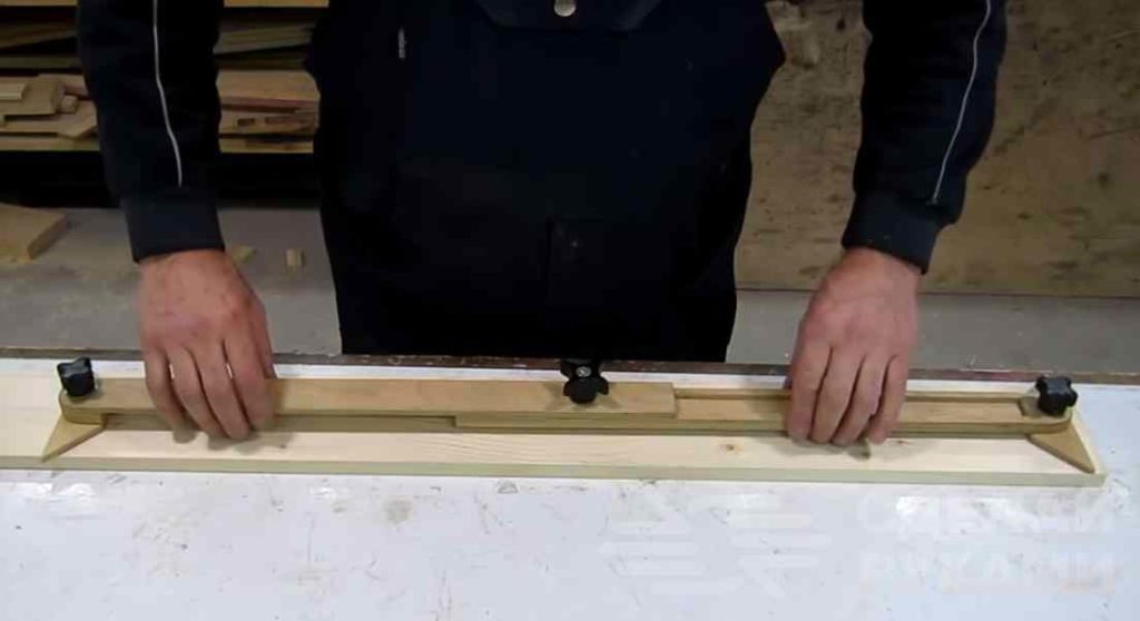 С обоих концов приспособления закреплены подвижные треугольные опоры со скошенным торцом по длинной стороне. Для фиксации подвижных частей линейки используются самодельные рукоятки.