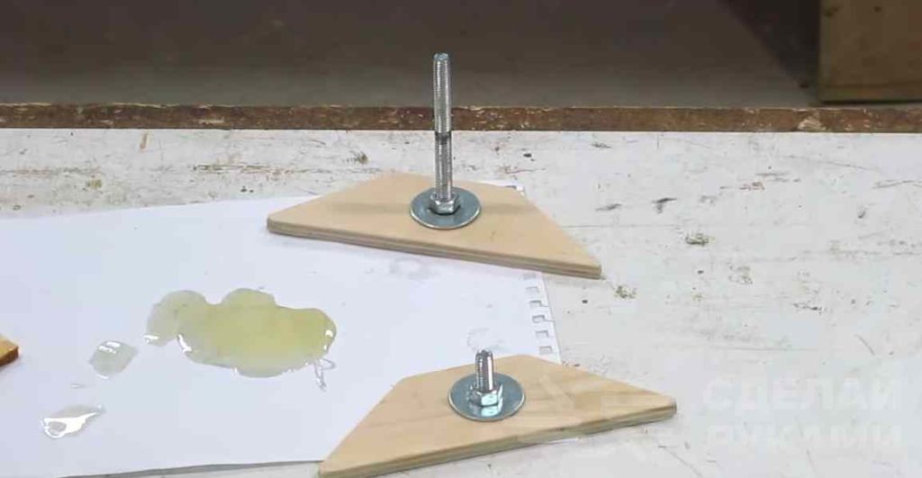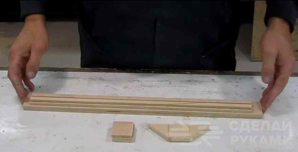 Сначала на основание паза автор приклеивает квадратный кусок фанеры. А на основание ползуна — два таких же отрезка.