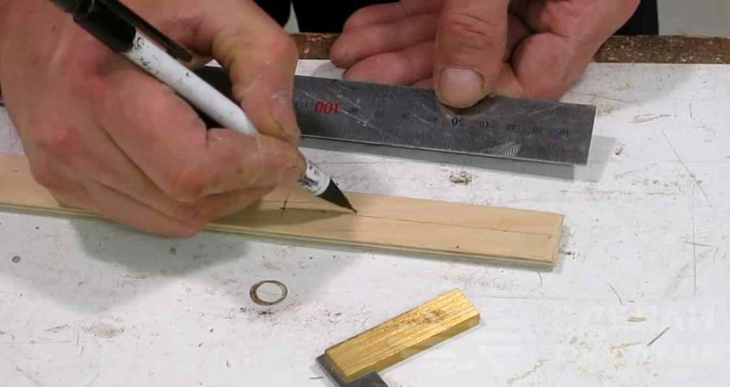 Из этого отрезка нужно будет выпилить все основные детали. После этого на кромках заготовок ползуна и направляющих паза автор делает скос под углом 14 град. Когда все заготовки деталей раздвижной линейки готовы, можно приступать к сборке.
