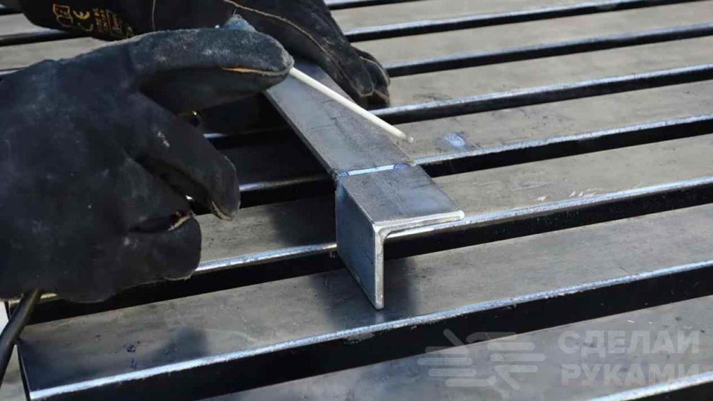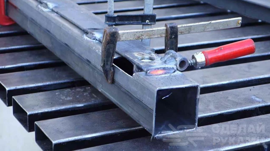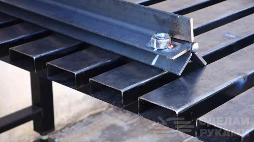 Теперь укладываем один из двух подвижных уголков, тот, в котором отверстие, на квадратную трубу и привариваем по всей длине. Также привариваем болты с внутренней стороны ко второму подвижному уголку, в трёх местах.