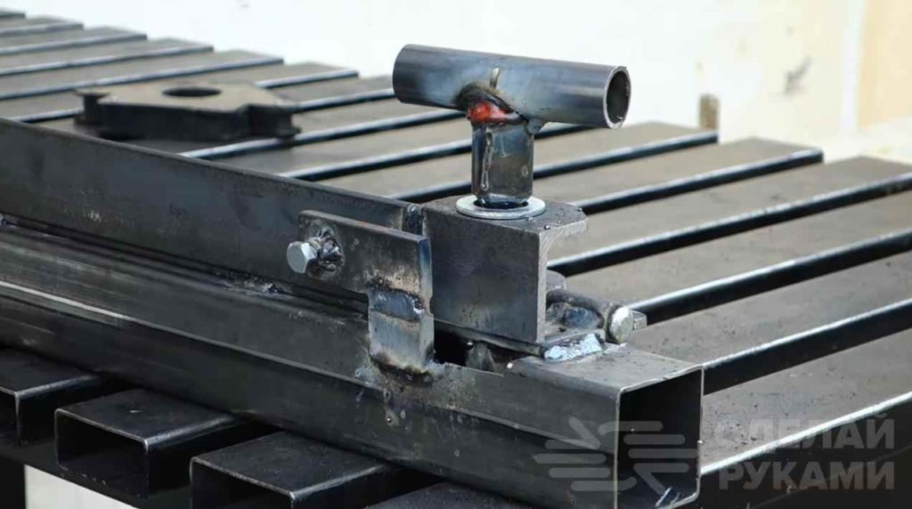 Отрезаем три одинаковых отрезка трубы и привариваем на края муфты для накручивания на болты. Вырезаем из кусочков металла небольшие укосины (ребра жесткости) и привариваем на движимом уголке.